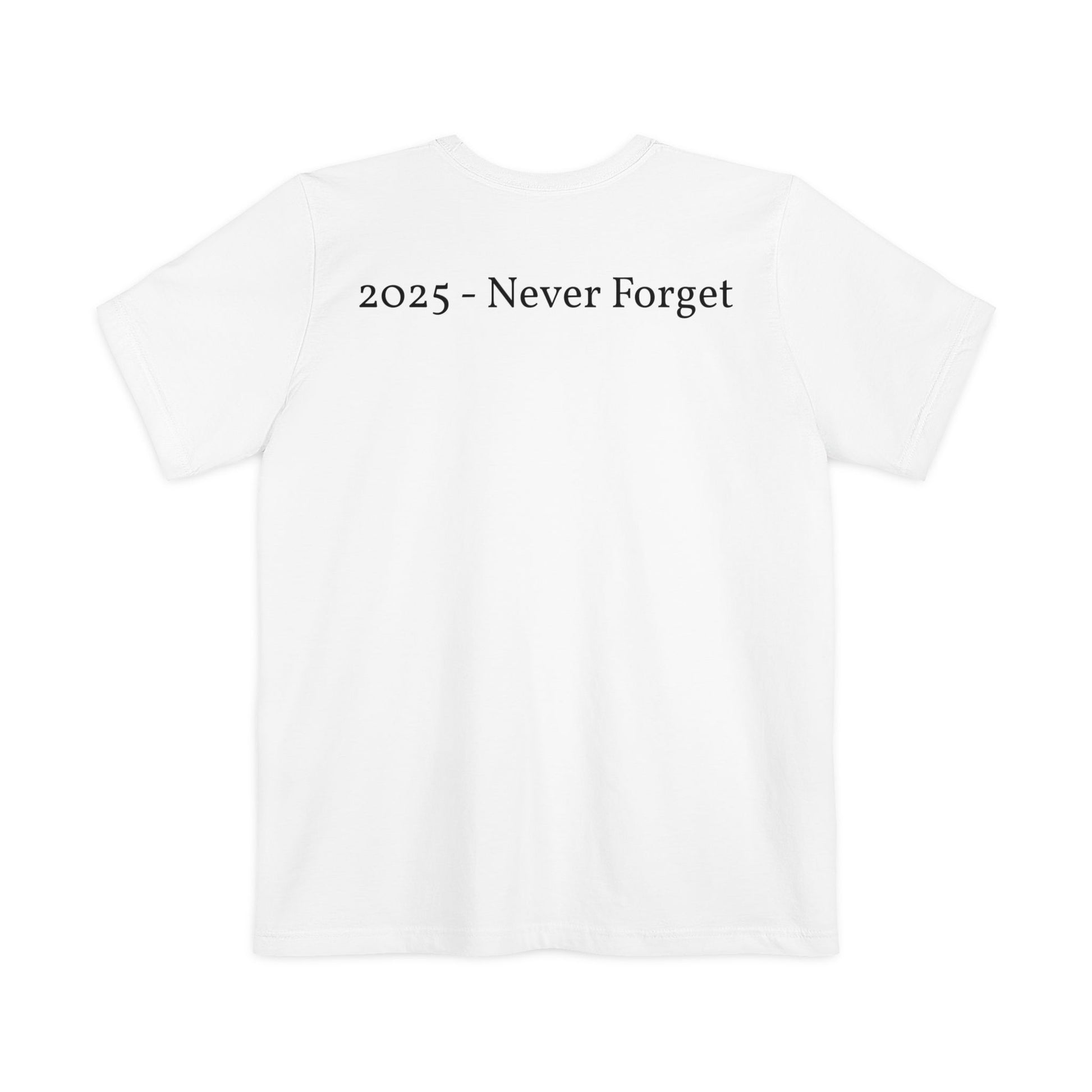 The Design Left chest pocket features clean, minimal typography — understated but unmistakable. Upper back carries the commemorative text: "2025 — Never Forget." Printed with soft-hand ink so it moves with the fabric and won't crack after washing.